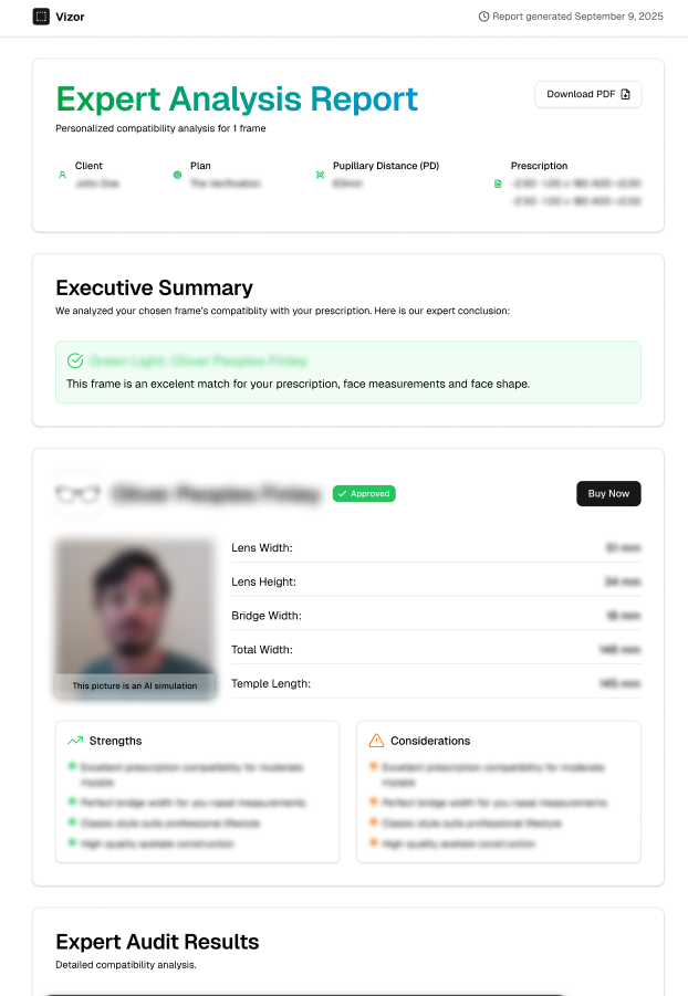Get a detailed report with specific recommendations. Buy your glasses with confidence.